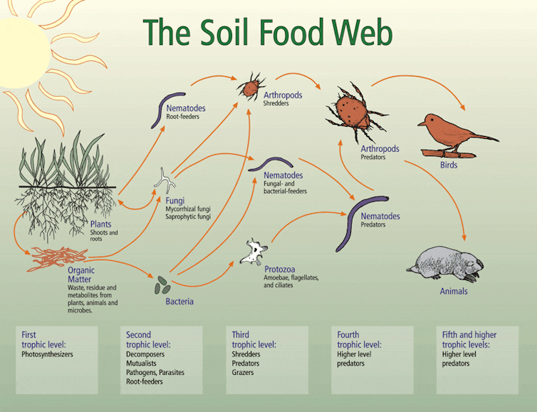 Soil microbiome in healthy soil is diverse and contains all these interactive elements. So many epiphitic and filial relations exist between members of the soil community, it is difficult to diagram them all. Each trophic level can concentrate minerals, nutrients and, sadly toxins, to tenfold increase above background levels in their tissues. All parts of this system provide vital resources for other trophic levels. Unlike above ground life, every creature or plant can feed on the others, making them top predators.